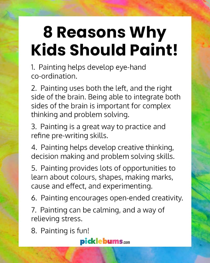 Hello! How was your weekend? Almost every child I've ever worked with has loved to paint, and all my kids love to paint too, and painting is so good for kids! This image I shared in facebook with 8 reasons why kids should paint was super popular! But... even though I know painting is good for kids, sometimes I just don’t want to spend ages setting up or cleaning up fancy art activities. So here are my top 5 quick, and easy painting ideas that are fun for everyone!